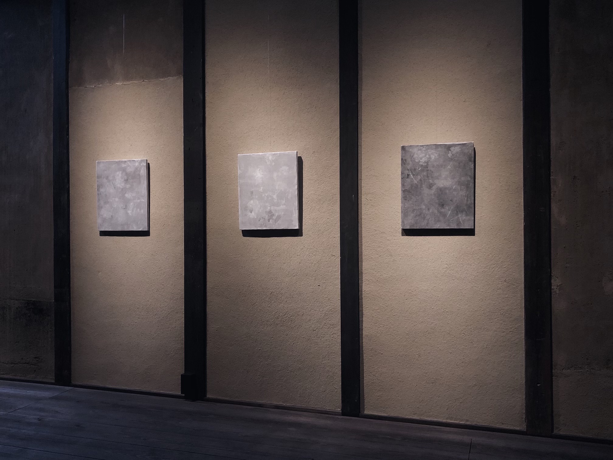 今回の作品では、私のイメージが画布上に胡粉や墨をもちいて筆を通して描かれ、水に洗い流す工程を経て布の組織に粒子として形を残します。作品によっては複数回繰り返します。この工程によって、私は物質の粒子性を強く意識させられました。私は絵を描くと同時にその布に出入りする粒子を見る観察者でもありました。